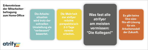 Zudem wurden die Mitarbeiter zu Ihren Erfahrungen mit dem Home-Office befragt, um über die unmittelbare Bewältigung der Krise hinaus Erkenntnisse für die Zukunft zu gewinnen. Allein die Teilnahmequote von 95% verdeutlichte die Bedeutung der Veränderung für die Mitarbeiter. Die große Mehrheit bewertete die neue Arbeitsrealität positiv aufgrund konzentrationsfördernder Arbeitsbedingungen und einer besseren Vereinbarkeit von Familie und Beruf. Gleichwohl vermissten die meisten den regelmäßigen und oft informellen Austausch mit den Kollegen. Daher organisiert atrify nun zufallsgenerierte virtuelle Meetings untereinander. Sobald es die Pandemie erlaubt, sind – auch auf Wunsch der Mitarbeiter – wieder 50% Büro-Präsenz angestrebt.