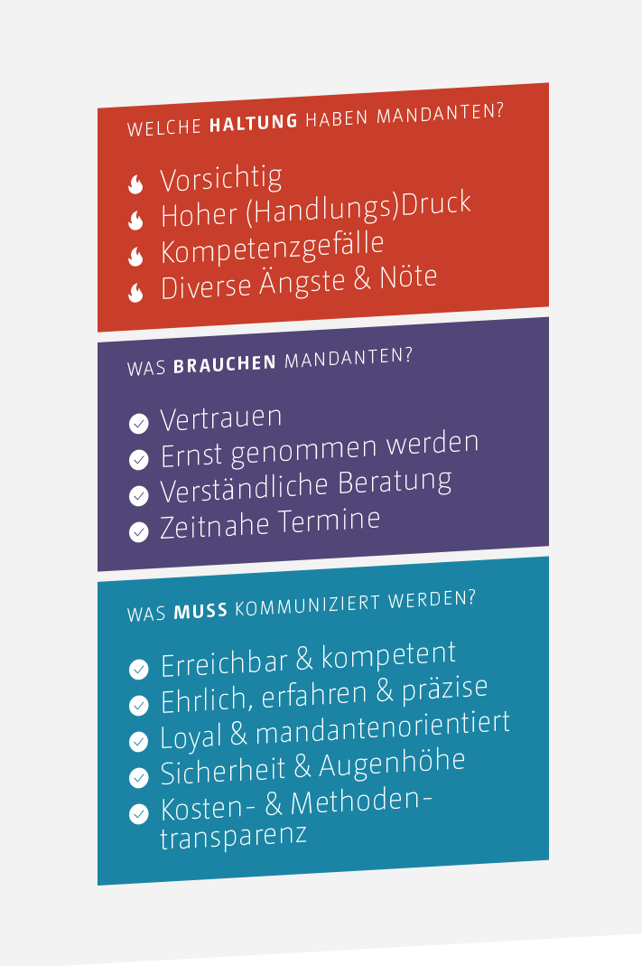 Strategisches Marketing für Kanzleien ist anspruchsvoll: Juristisches Fachwissen muss verständlich und gleichzeitig präzise kommuniziert werden, echte Mandantennöte sollten adressiert werden und der Mehrwert klar gezeigt. Und vor allem: eine vertrauenswürdige Kanzleipersönlichkeit entwickelt und transportiert werden. Denn was unterscheidet sonst Kanzlei A von Kanzlei B? Mit einer klaren Positionierung entsteht ein authentischer Auftritt, der Vertrauen schafft und im Gedächtnis bleibt.
